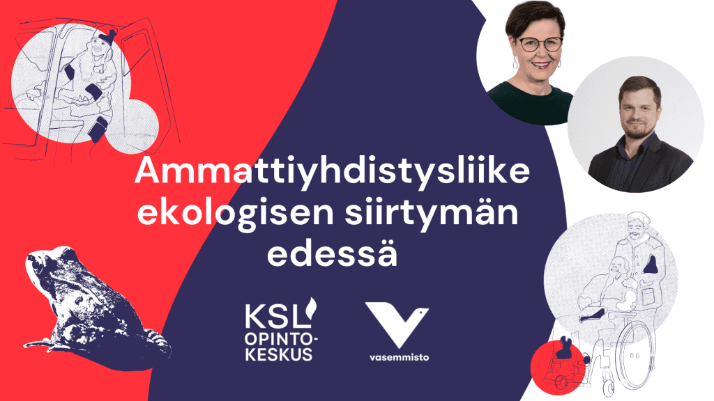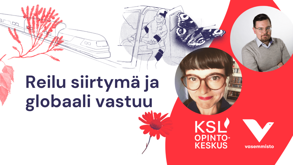 Reilu siirtymä ja työn murros -webinaarisarjassa käsitellään ympäristön, työn ja hyvinvoinnin kysymyksiä hyvinvointivaltion, kuntien, elinkeinorakenteen ja ammattiyhdistysliikkeen näkökulmista. Keskustelijoina on joukko asiantuntijoita ja yhteiskunnallisia vaikuttajia. Jaksojen kuvaukset löydät alhaalta ja tallenteet voi katsoa KSL:n YouTube-kanavalta.